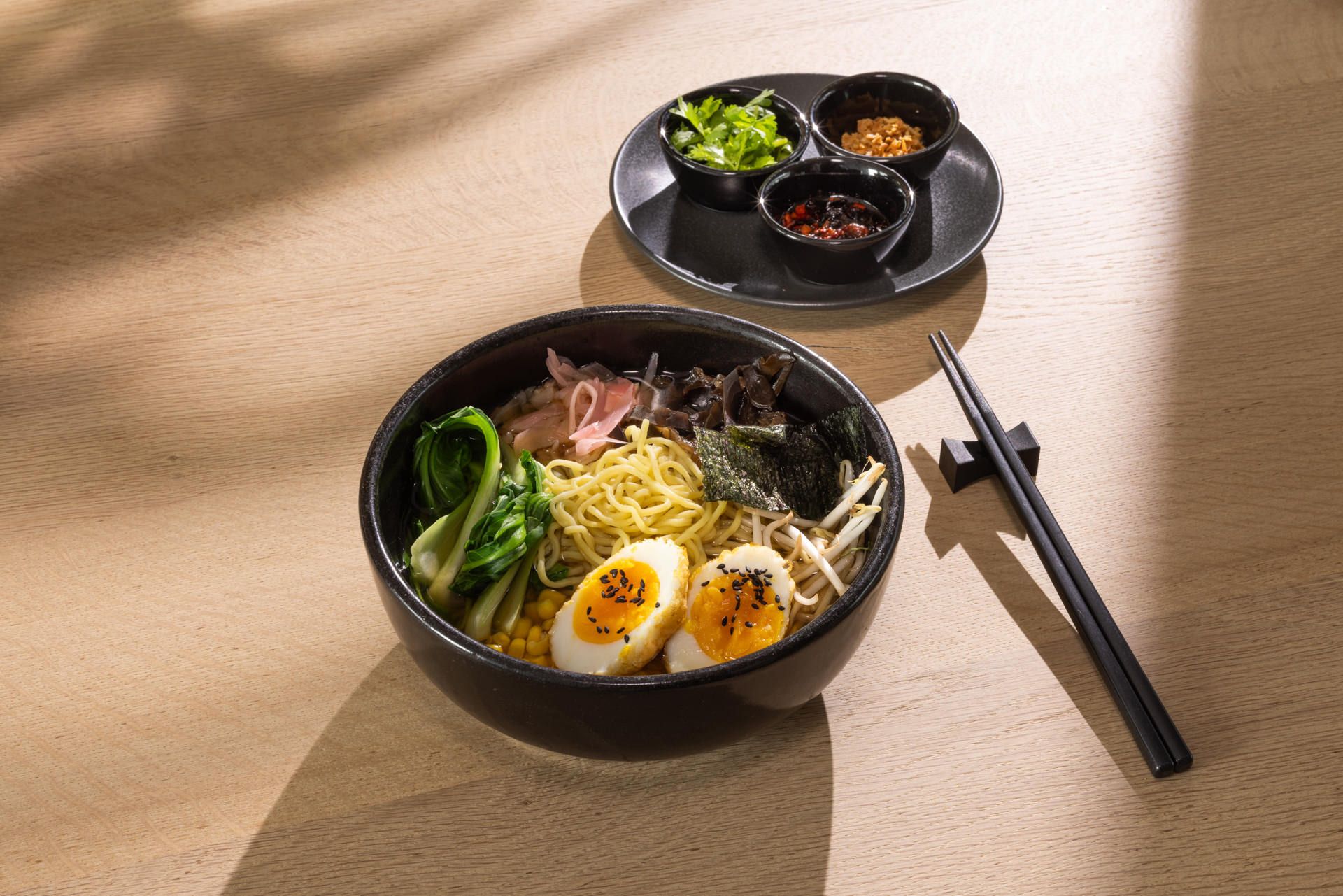 Ramen noodles, pak choi, spring onions, nori, moo-err, corn, pink ginger, egg