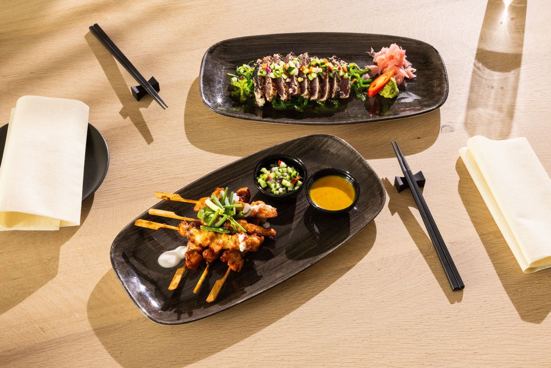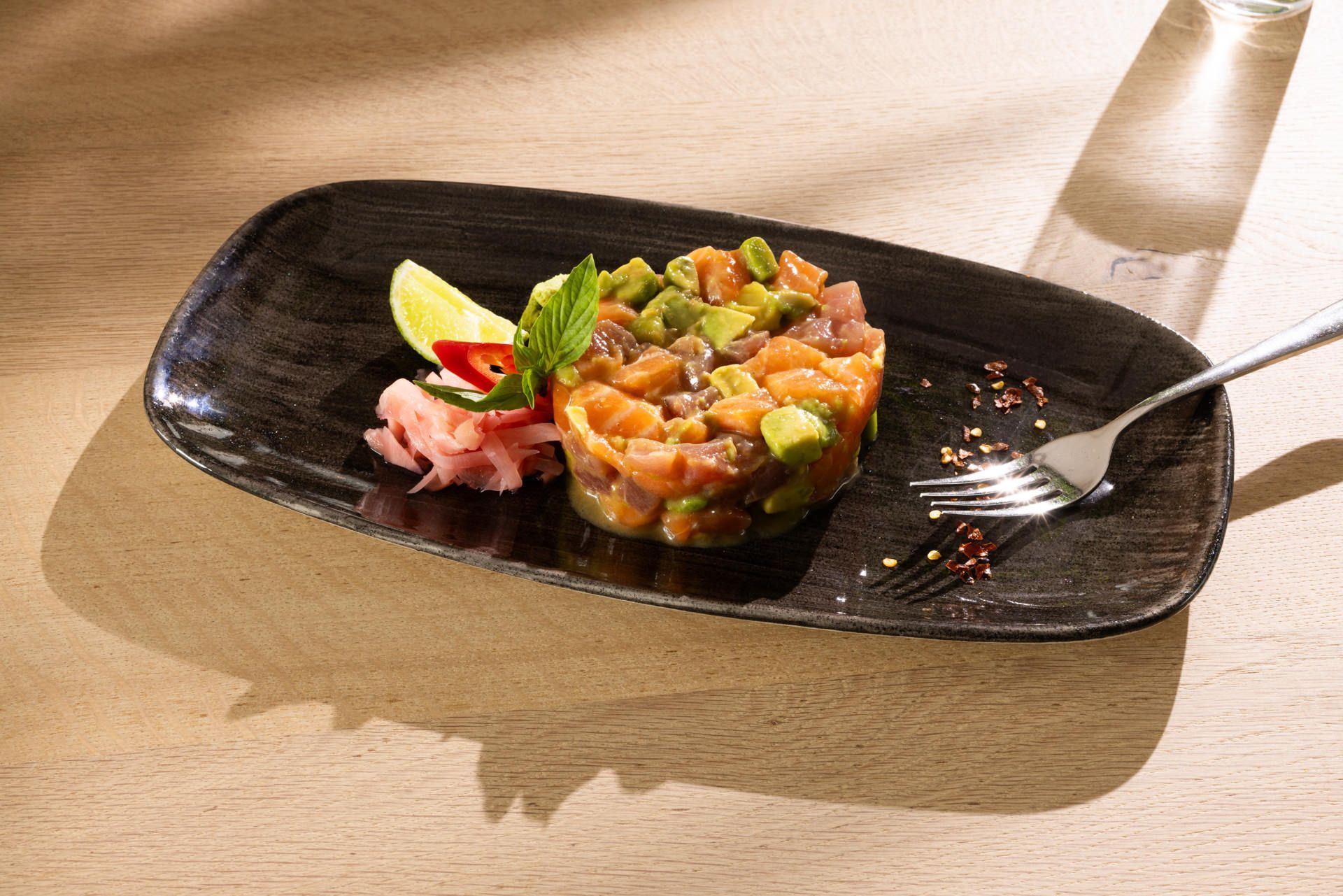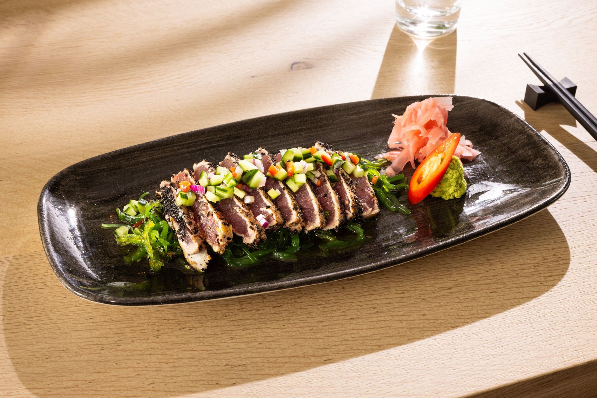 Pan-fried tuna steak with sesame – served with wakame salad, wasabi and pink ginger