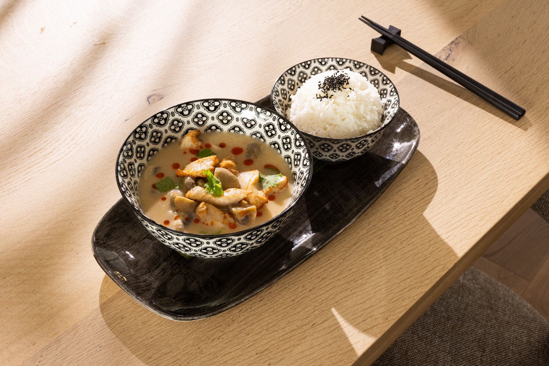Spicy coconut milk soup with chicken, mushrooms and fresh coriander