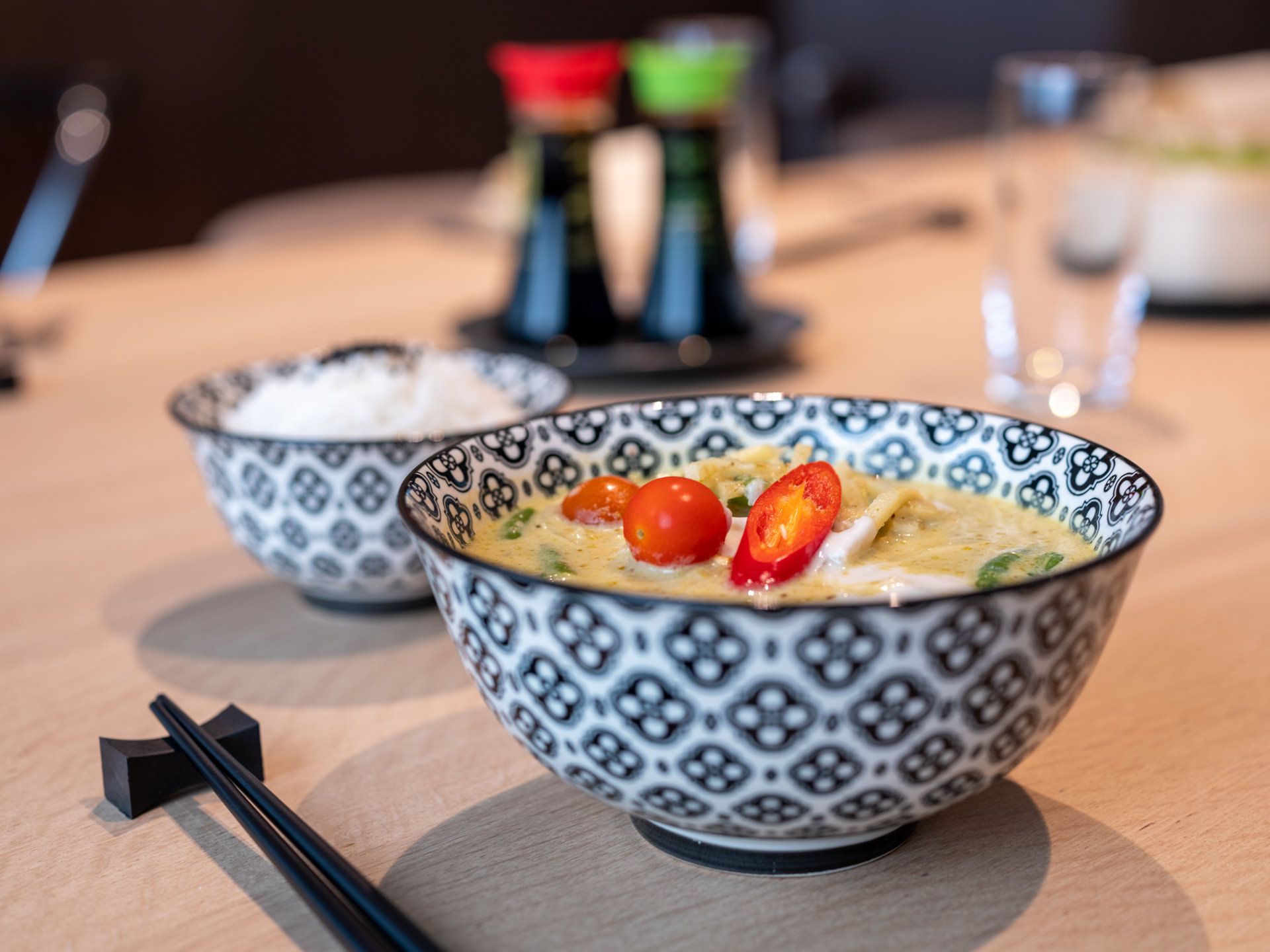 Red coconut curry with cherry tomatoes, bamboo shoots, green beans and Thai basil